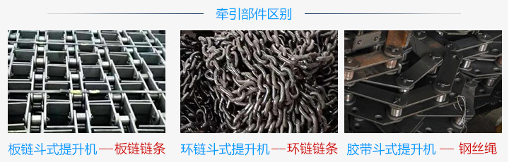 環(huán)鏈斗式提升機(jī)牽引件選用優(yōu)質(zhì)合金鋼高度圓環(huán)鏈;板鏈斗式提升機(jī)的鏈條是優(yōu)質(zhì)合金鋼高強(qiáng)度板式鏈條;膠帶斗式提升機(jī)采用高強(qiáng)度的鋼絲繩作為牽引部件。