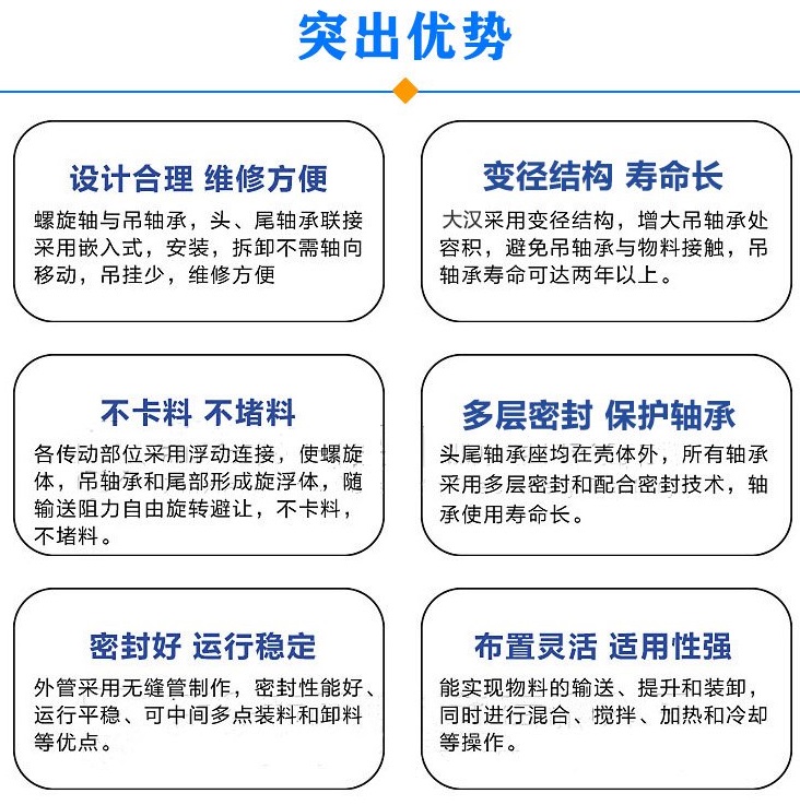 以上是對螺旋輸送機(jī)的介紹,產(chǎn)品規(guī)格有(管型、U型)(單軸、無軸),外殼葉片材質(zhì):碳鋼、不銹鋼,根據(jù)被輸送物料的粒度、輸送量和輸送距離,合理選擇和設(shè)計,做到不堵塞、不起拱、出料順暢。